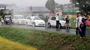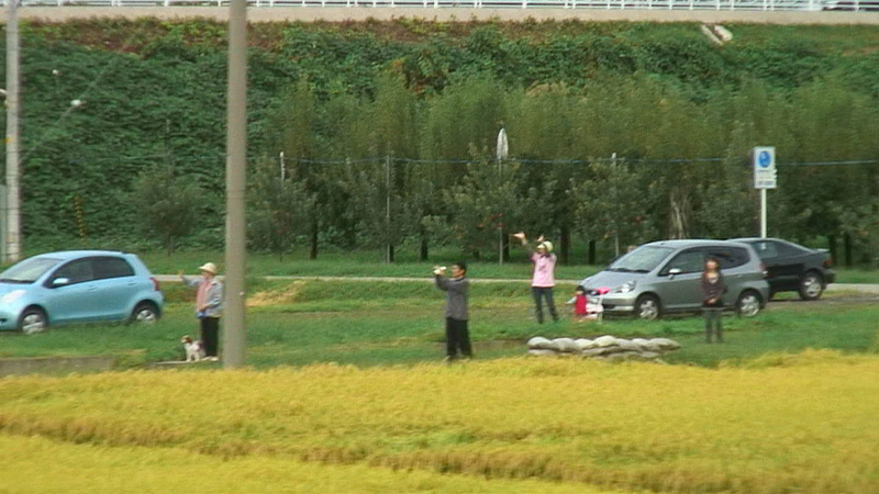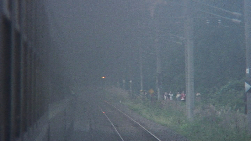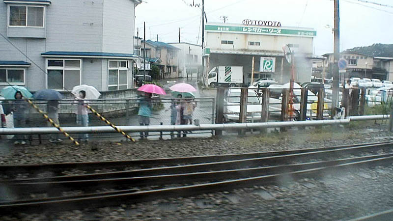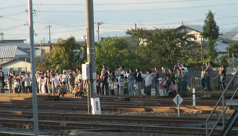 秋田駅出発直後。あいにくの雨模様にもかかわらず、沿線には多くの方がお見送り。 |