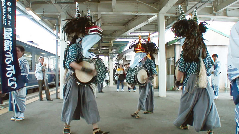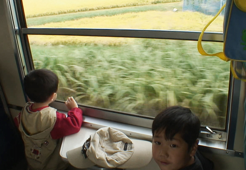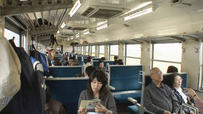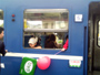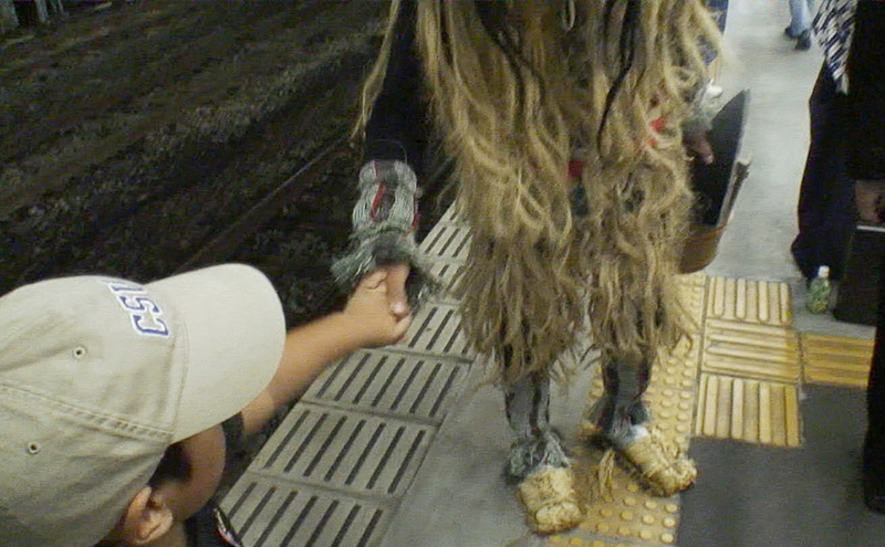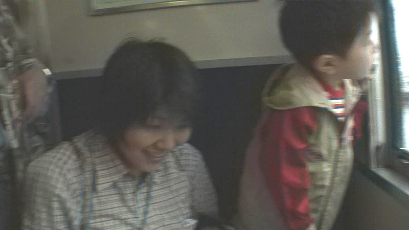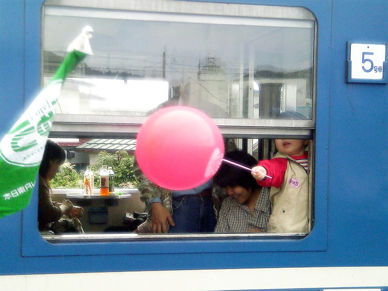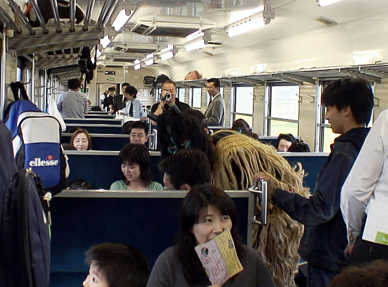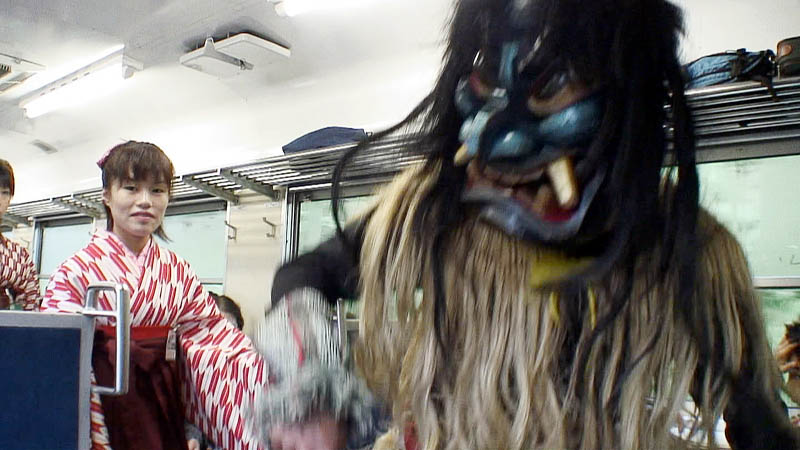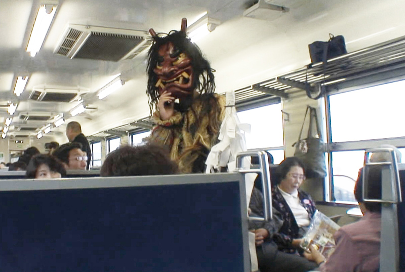 秋田名物なまはげ。子供が多い車内で大活躍していました。うちの子は男鹿で何回も脅されているので、もうすっかり慣れっこでした。なまはげに扮したお兄ちゃん達、シラケさせてゴメンね。 |