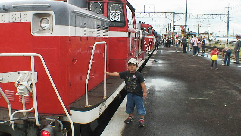 大きな汽笛の音に、思わず耳をふさいで逃げる子供がめんけがった。。。 |
